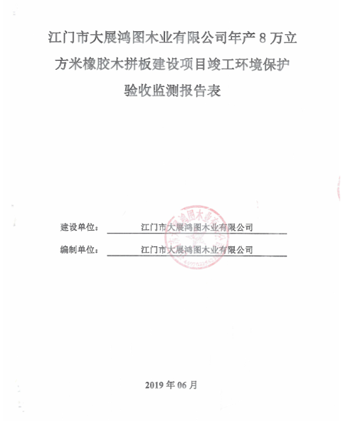 2、审批部门审批决定 江门市大展鸿图木业有限公司: 你公司报批的《江门市大展鸿图木业有限公司年产8万立方米橡胶木拼板建设项目环境影响报告表》(以下简称《报告表》)等材料收悉。经研究,批复如下: 一、江门市大展鸿图木业有限公司年产8万立方米橡胶木拼板建设项目选址位于江门市蓬江区杜阮镇南北大道侧起龙山地段B区1#厂房,项目建成后计划年生产橡胶木拼板8万立方米。