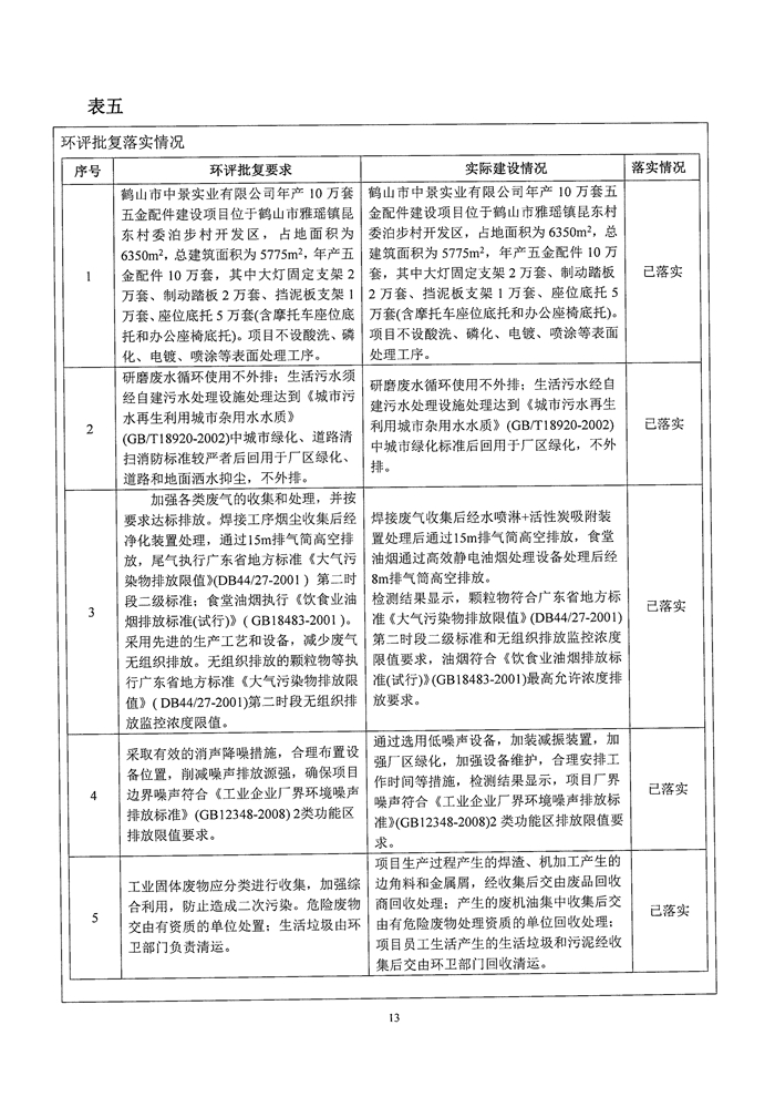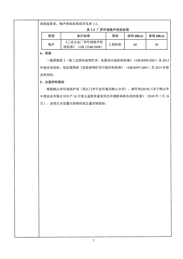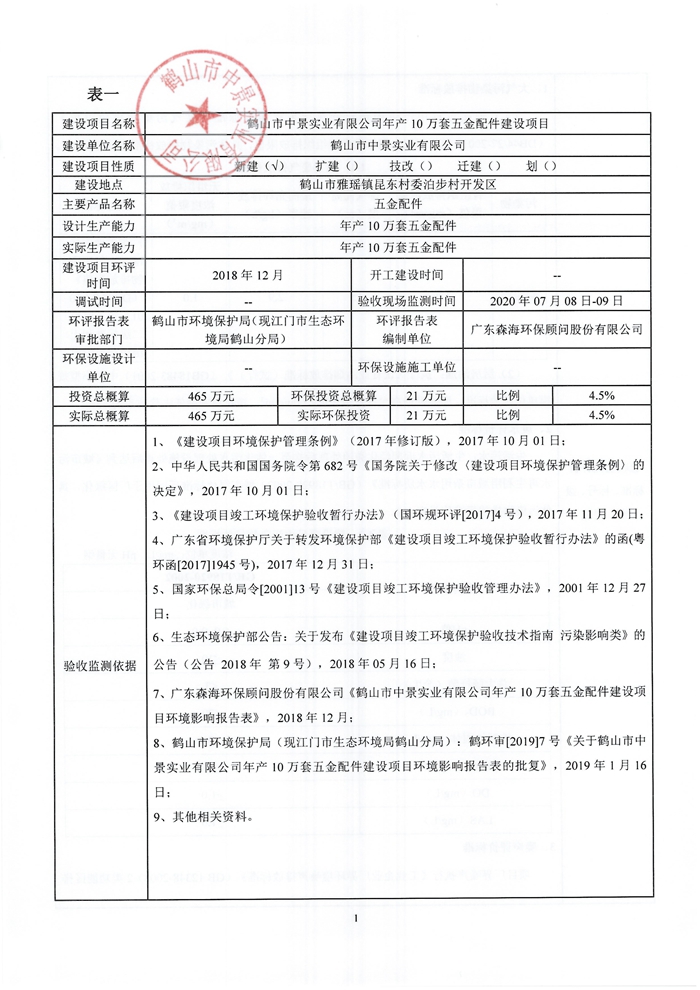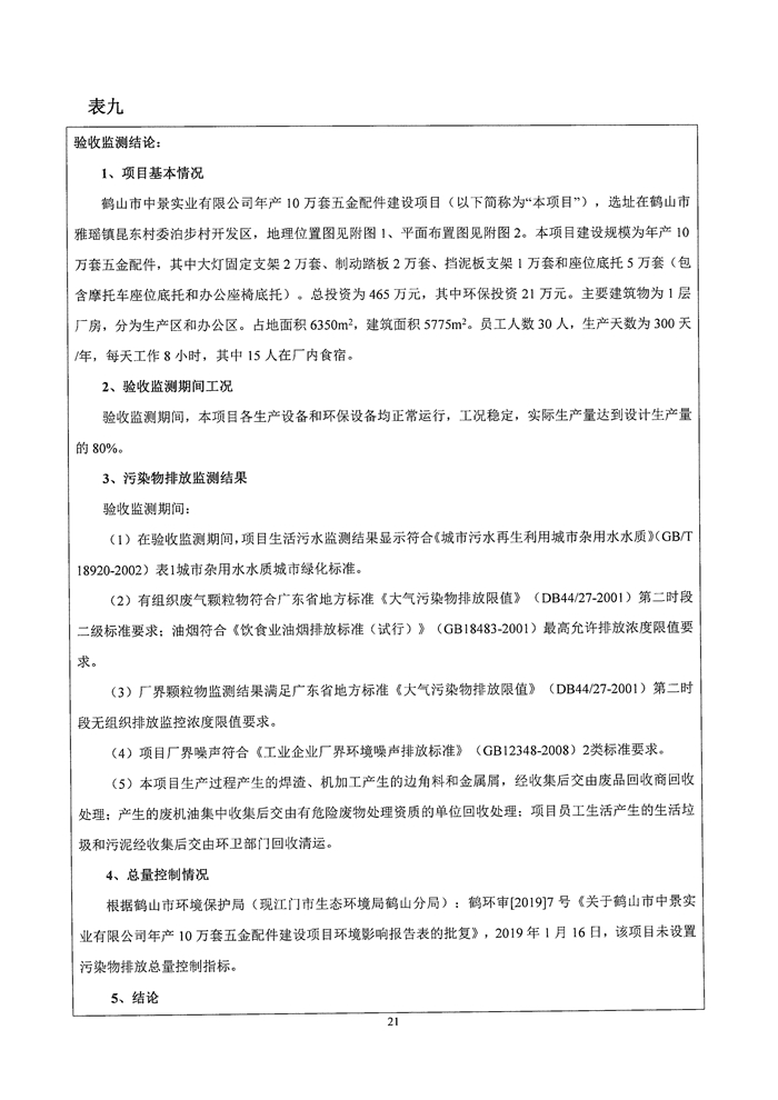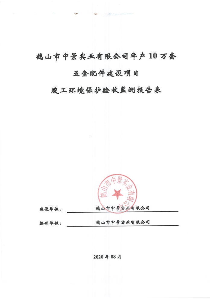鹤山市中景实业有限公司年产10万套五金配件建设项目验收监测报告表