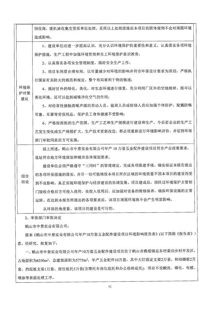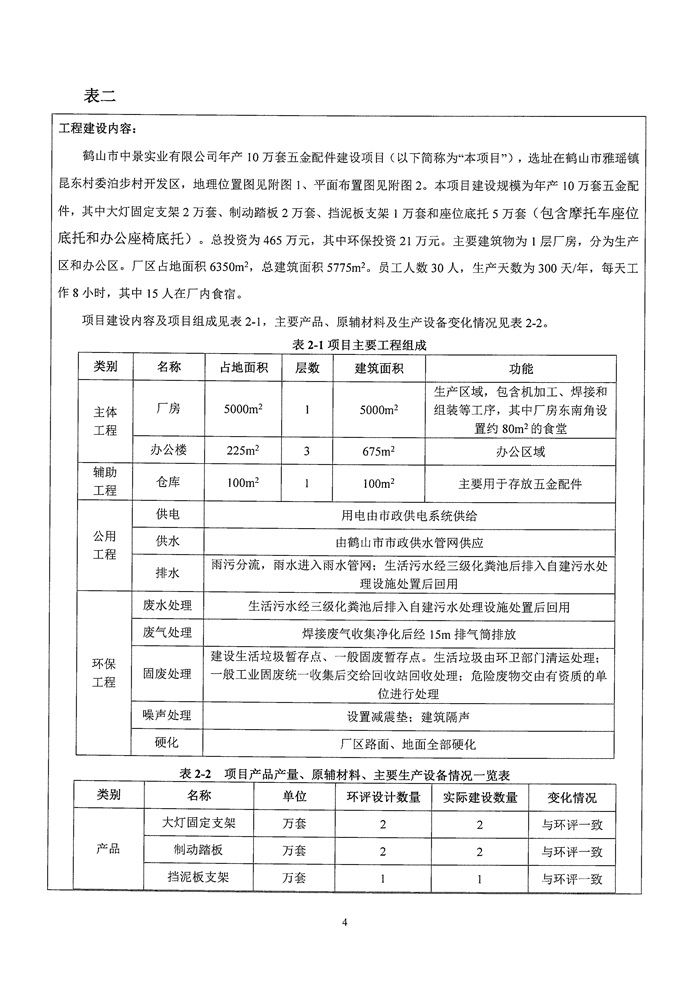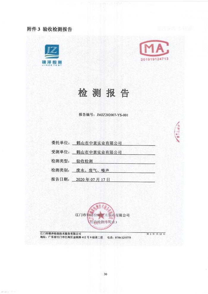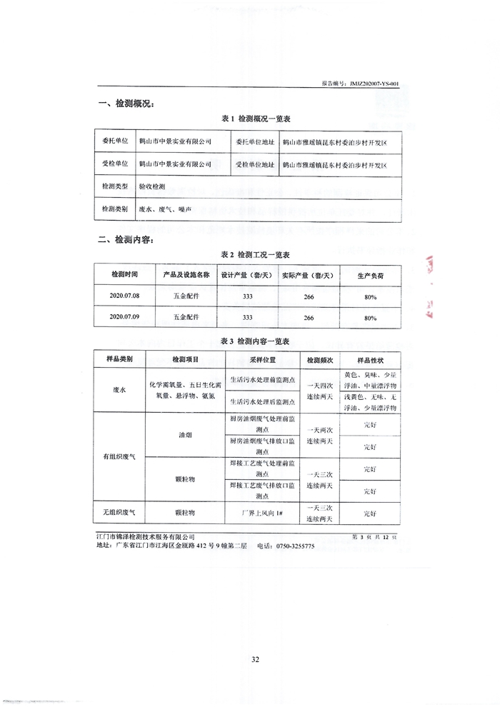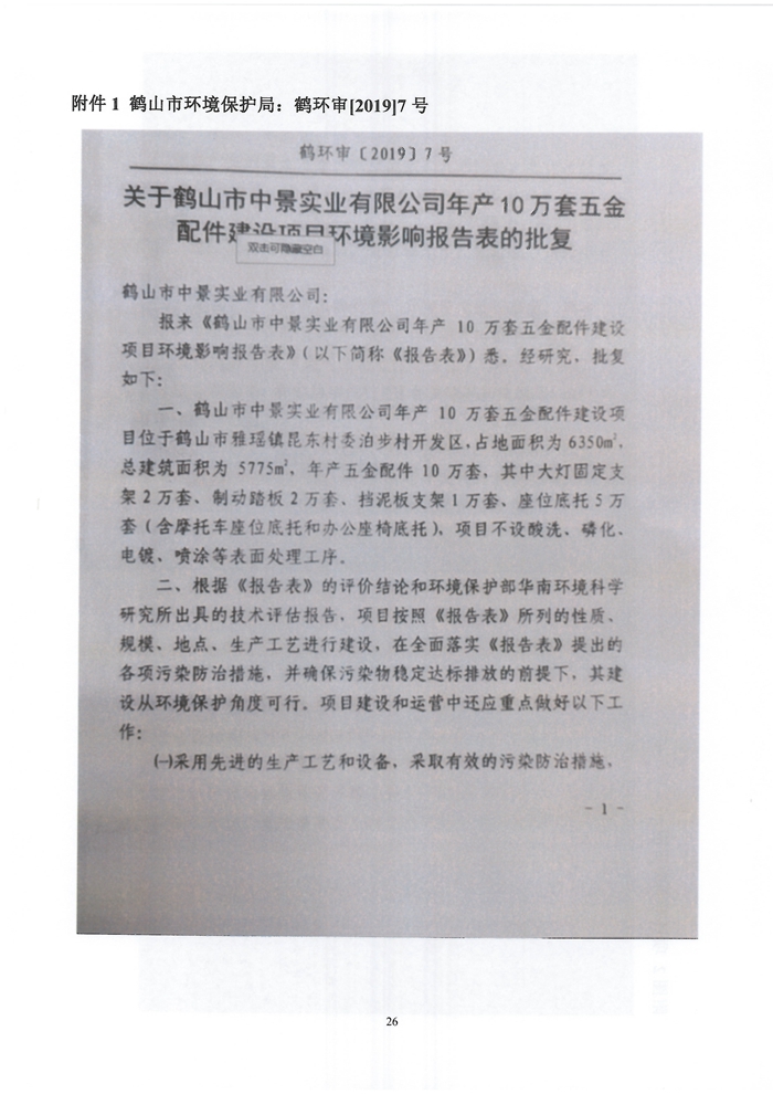 鹤山市中景实业有限公司年产10万套五金配件建设项目验收监测报告表