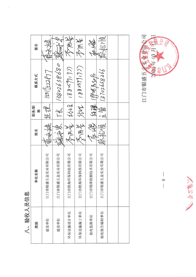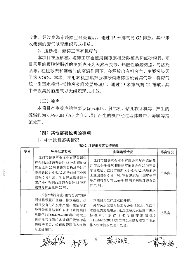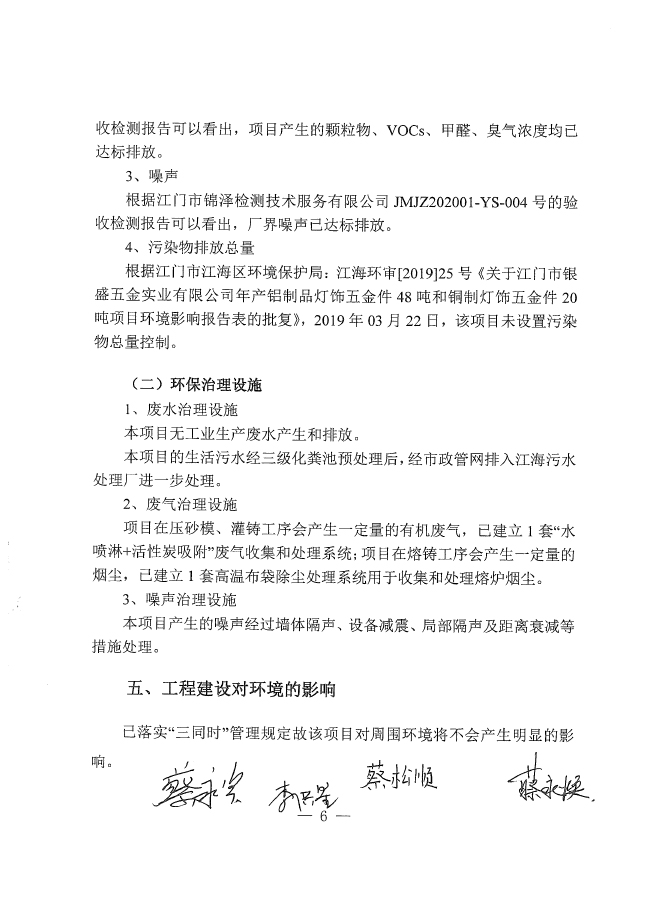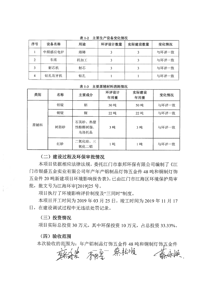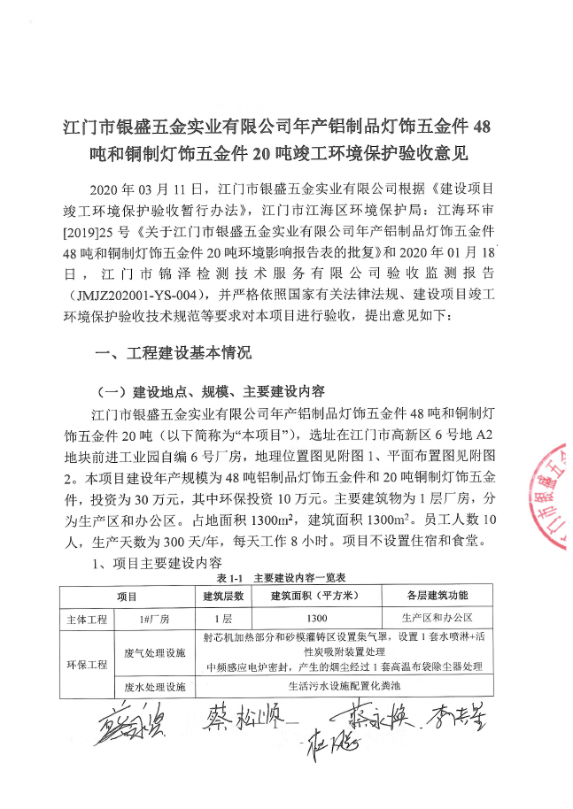 江门市银盛五金实业有限公司年产铝制灯饰五金件48吨和铜制灯饰五金件20吨项目竣工环境保护验收意见(公示稿)