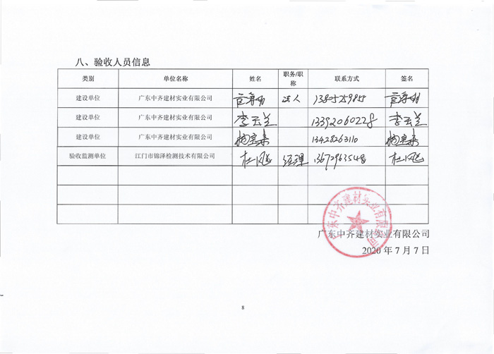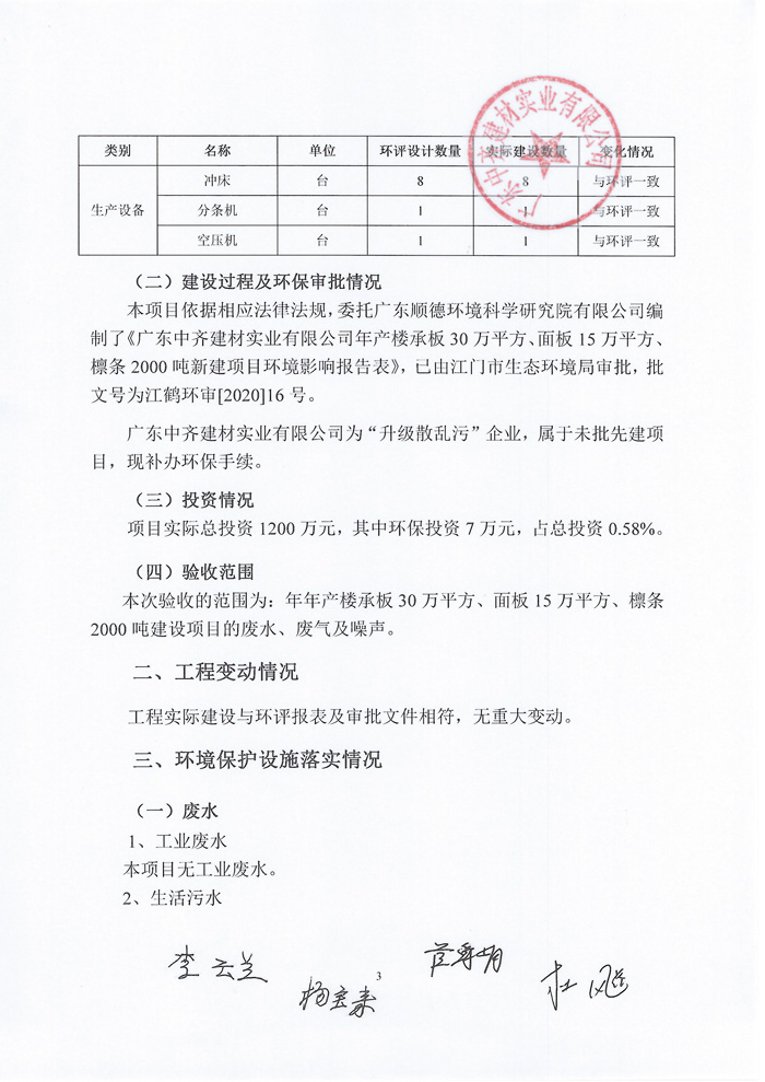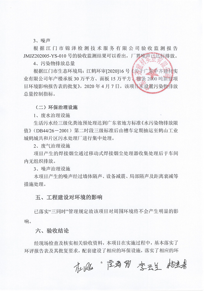 广东中齐建材实业有限公司年产楼承板30万平方、面板15万平方、檩条2000吨新建项目竣工环境保护验收意见