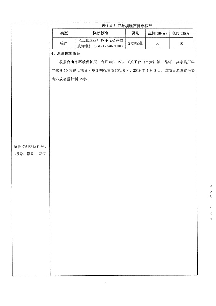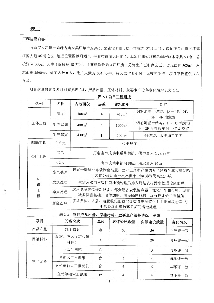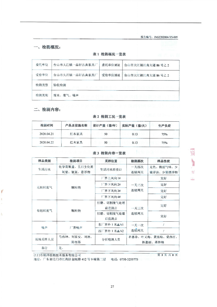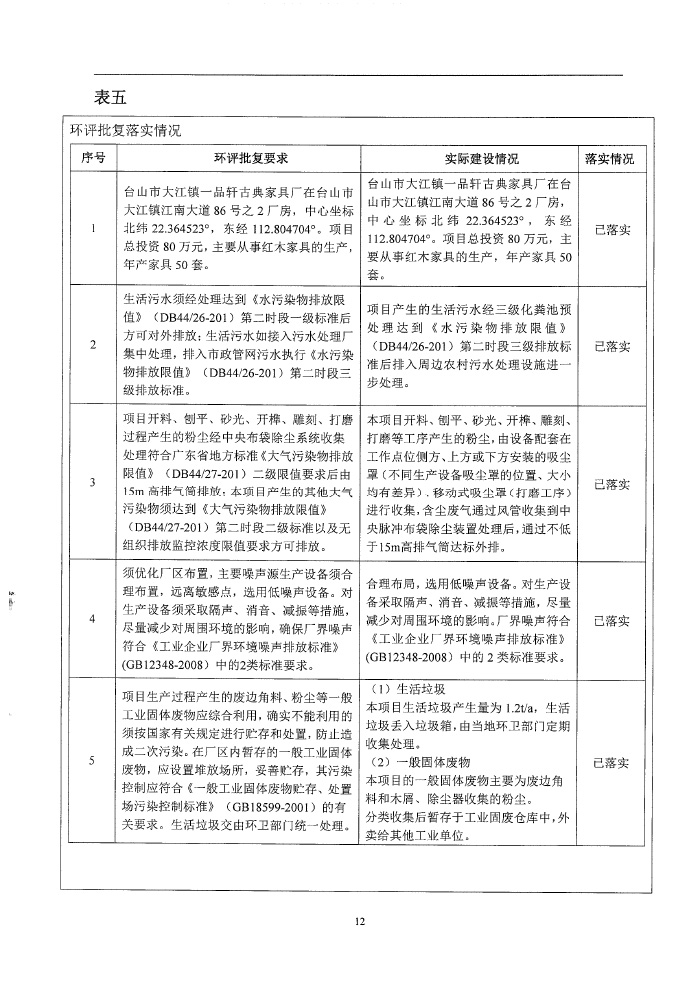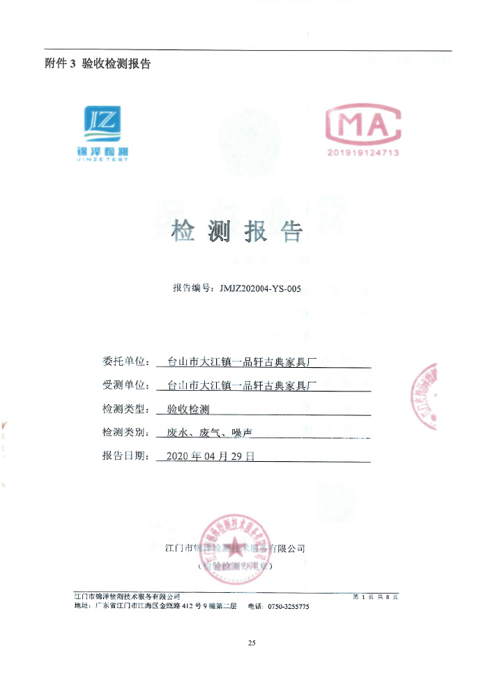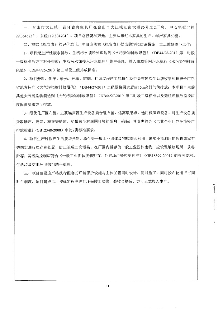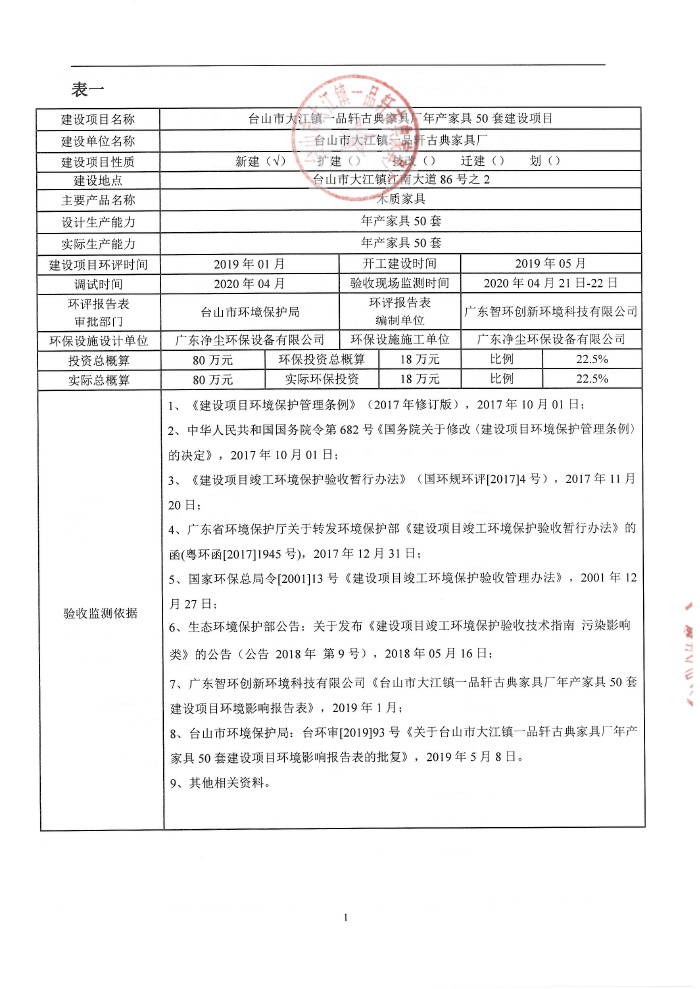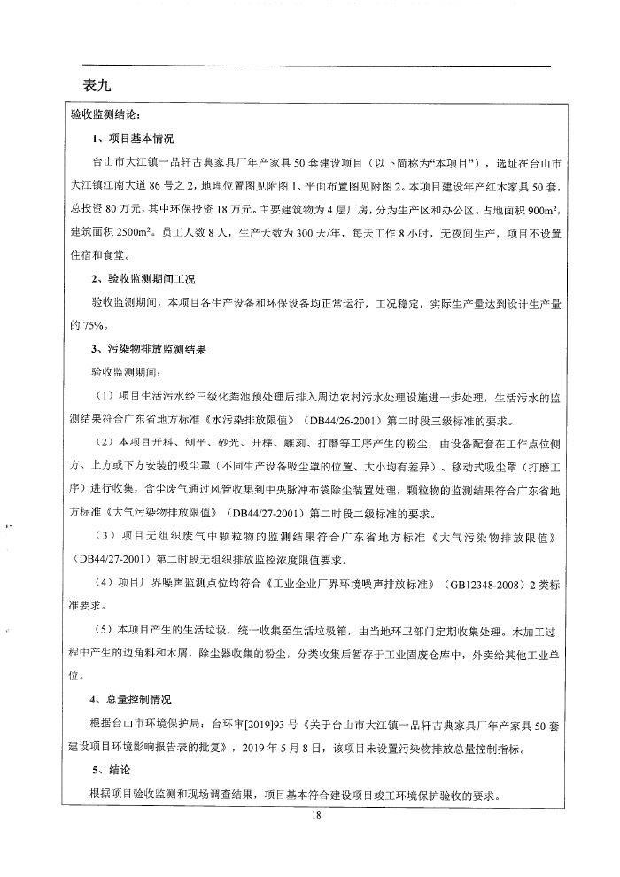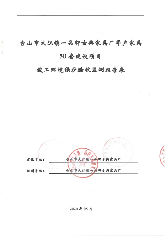 台山市大江镇一品轩古典家具厂环保竣工验收报告表