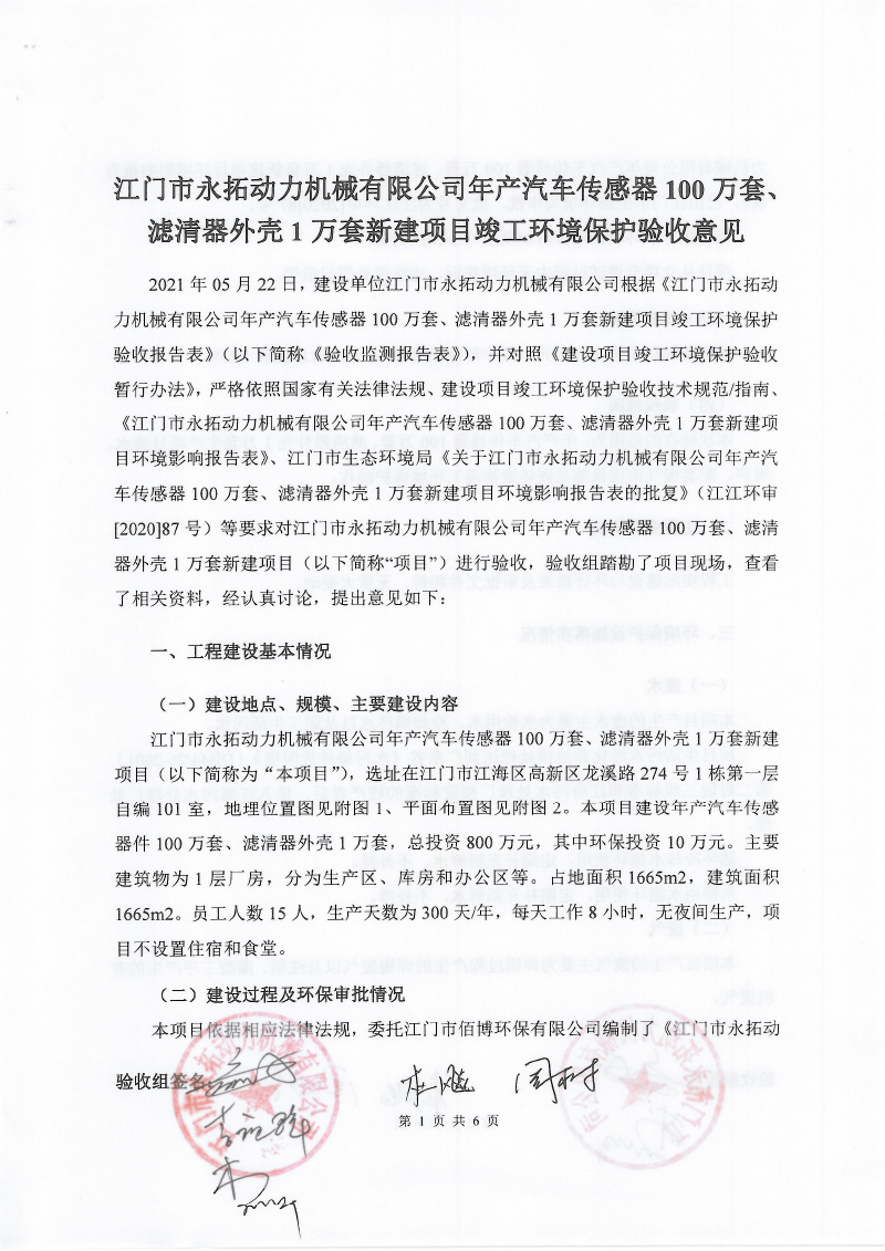 江门市永拓动力机械有限公司年产汽车传感器100万套、滤清器外壳1万套新建项目自主验收意见 扫描件-1